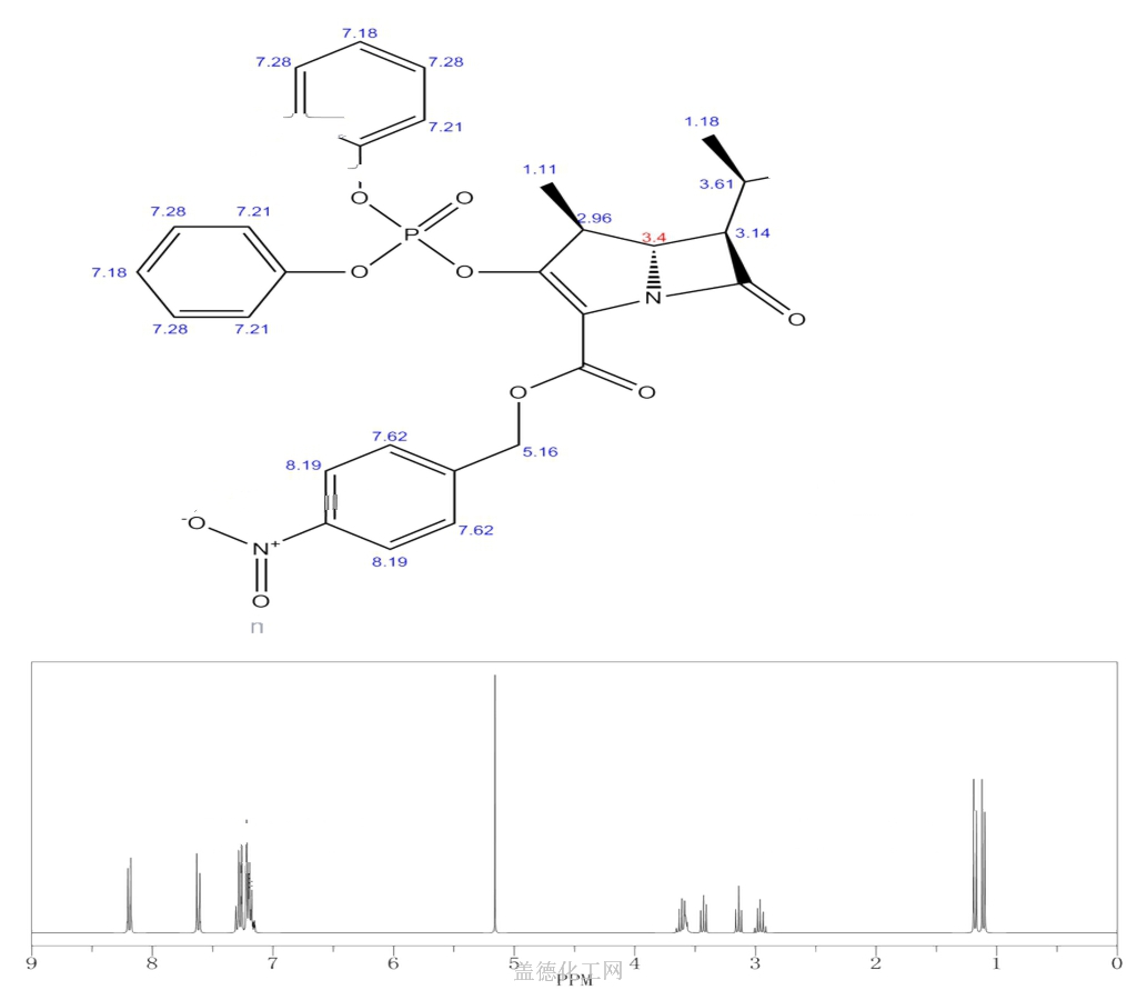 英文名称:4-Nitrobenzyl (4S,5R,6S)-3-[(diphenylphosphono)oxy]-6-[(R)-1-hydroxyethyl]- 4-Methyl-7-oxo-1-azabicyclo[3.2.0]hept-2-ene-2-carboxylate