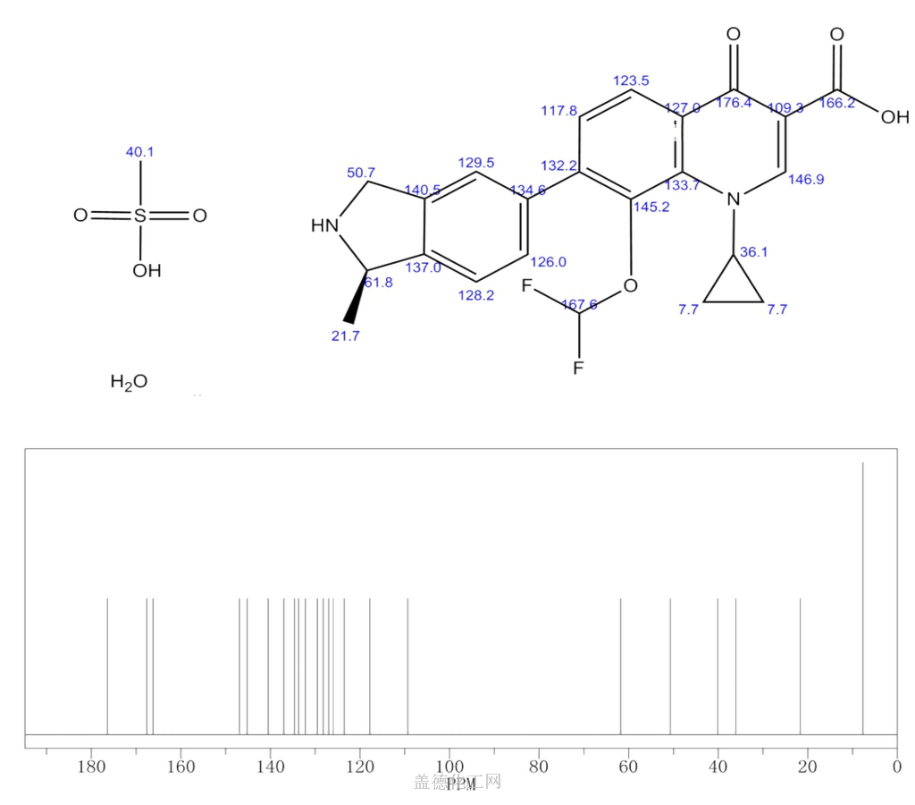 - 英文名称:Garenoxacin mesylate [USAN];BMS-284756-01;1-cyclopropyl-8-(difluoromethoxy)-7-[(1R)-1-methyl-2,3-dihydro-1H-isoindol-5-yl]-4-oxo-quinoline-3-carboxylic acid; methanesulfonic acid; hydrate;1-Cyclopropyl-8-(difluoromethoxy)-7-((1R)-1-methyl-2,3-dihydro-1H-isoindol-5-yl)-4-oxo-1,4-dihydroquinoline-3-carboxylic acid monomethanesulfonate monohydrate;3-Quinolinecarboxylic acid, 1-cyclopropyl-8-(difluoromethoxy)-7-((1R)-2,3-dihydro-1-methyl-1H-isoindol-5-yl)-1,4-dihydro-4-oxo-, monomethanesulfonate, monohydrate;Garenoxacin Mesylate;