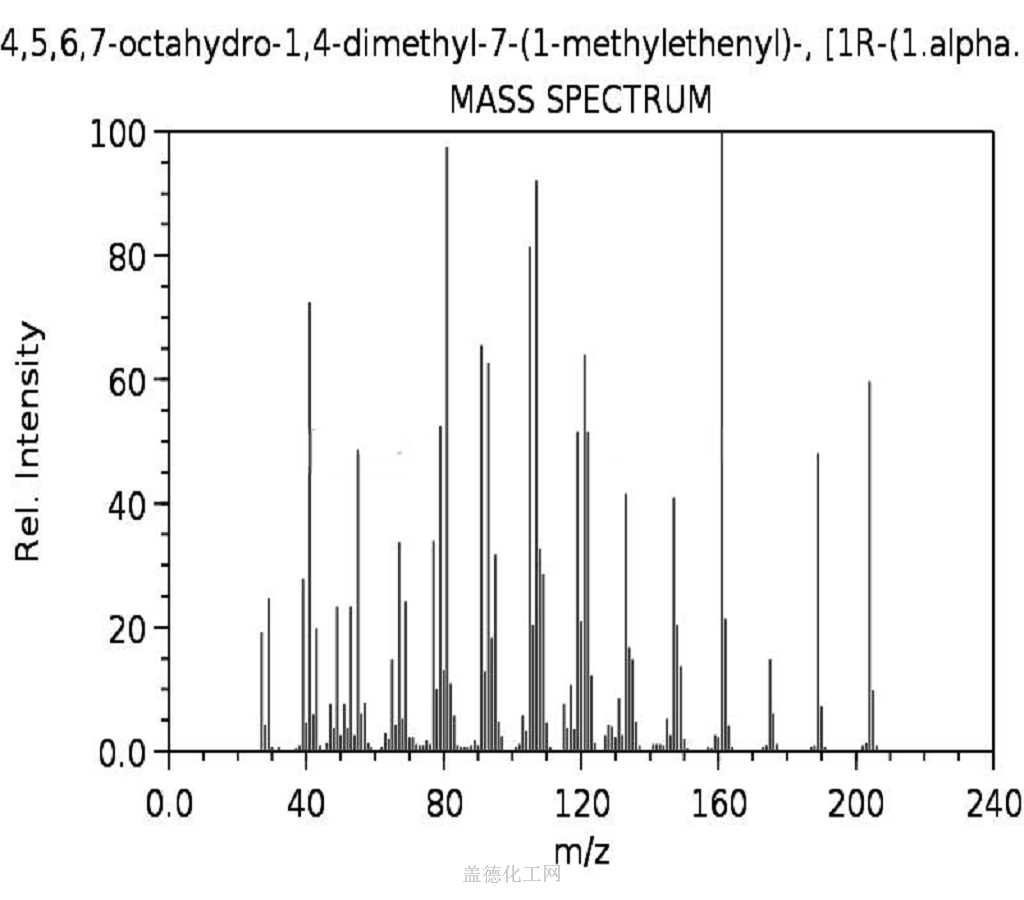 - 英文名称:1b,4bH,10bH-Guaia-5,11-diene (8CI); Azulene, 1,2,3,3a,4,5,6,7-octahydro-1,4-dimethyl-7-(1-methylethenyl)-,[1R-(1a,3ab,4a,7b)]-; (+)-g-Gurjunene;1,2,3,3a,4,5,6,7-Octahydro-1,4-dimethyl-7-(1-methylethenyl)-[1R-(1a,3ab,4a,7b)]-azulene; 5,11-Guaiadiene; g-Gurjunene