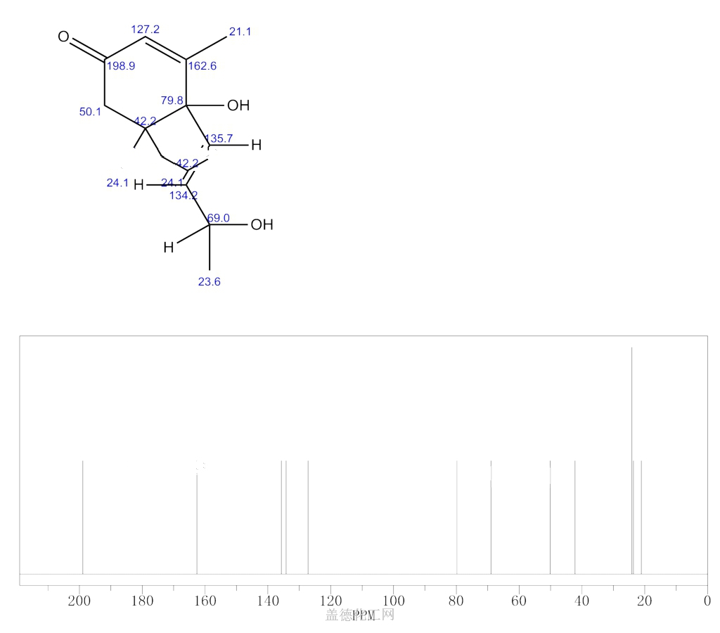 - 英文名称:2-Cyclohexen-1-one,4-hydroxy-4-(3-hydroxy-1-butenyl)-3,5,5-trimethyl-, (+)- (8CI);2-Cyclohexen-1-one, 4-hydroxy-4-(3-hydroxy-1-butenyl)-3,5,5-trimethyl-,[S-[R*,S*-(E)]]-; 2-Cyclohexen-1-one,4-hydroxy-4-[(1E,3R)-3-hydroxy-1-butenyl]-3,5,5-trimethyl-, (4S)- (9CI);(+)-Blumenol A; (+)-Vomifoliol; (6S,7E,9R)-6,9-Dihydroxy-4,7-megastigmadien-3-one;Blumenol A; Roseoside aglycon; Vomifoliol