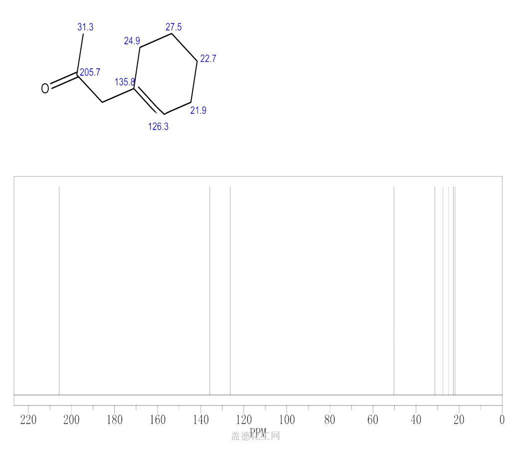 - 英文名称:2-Propanone,(1-cyclohexen-1-yl)- (6CI,7CI); 1-Acetonylcyclohexene;1-Cyclohexenyl-2-propanone; 1-Cyclohexenylacetone; NSC 22292